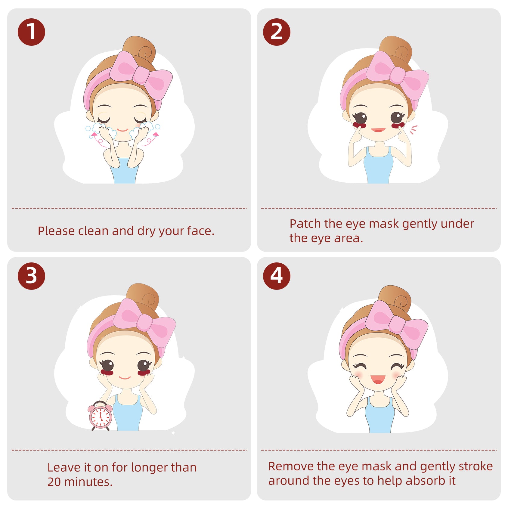- Easy to Use: Clean your face and eyes with warm water, then put the eye patches under your eyes and press gently to secure them. Keep it for 20 minutes, and then remove the eye patches and gently pat the remaining essence. Twice a day or at least once a week.
